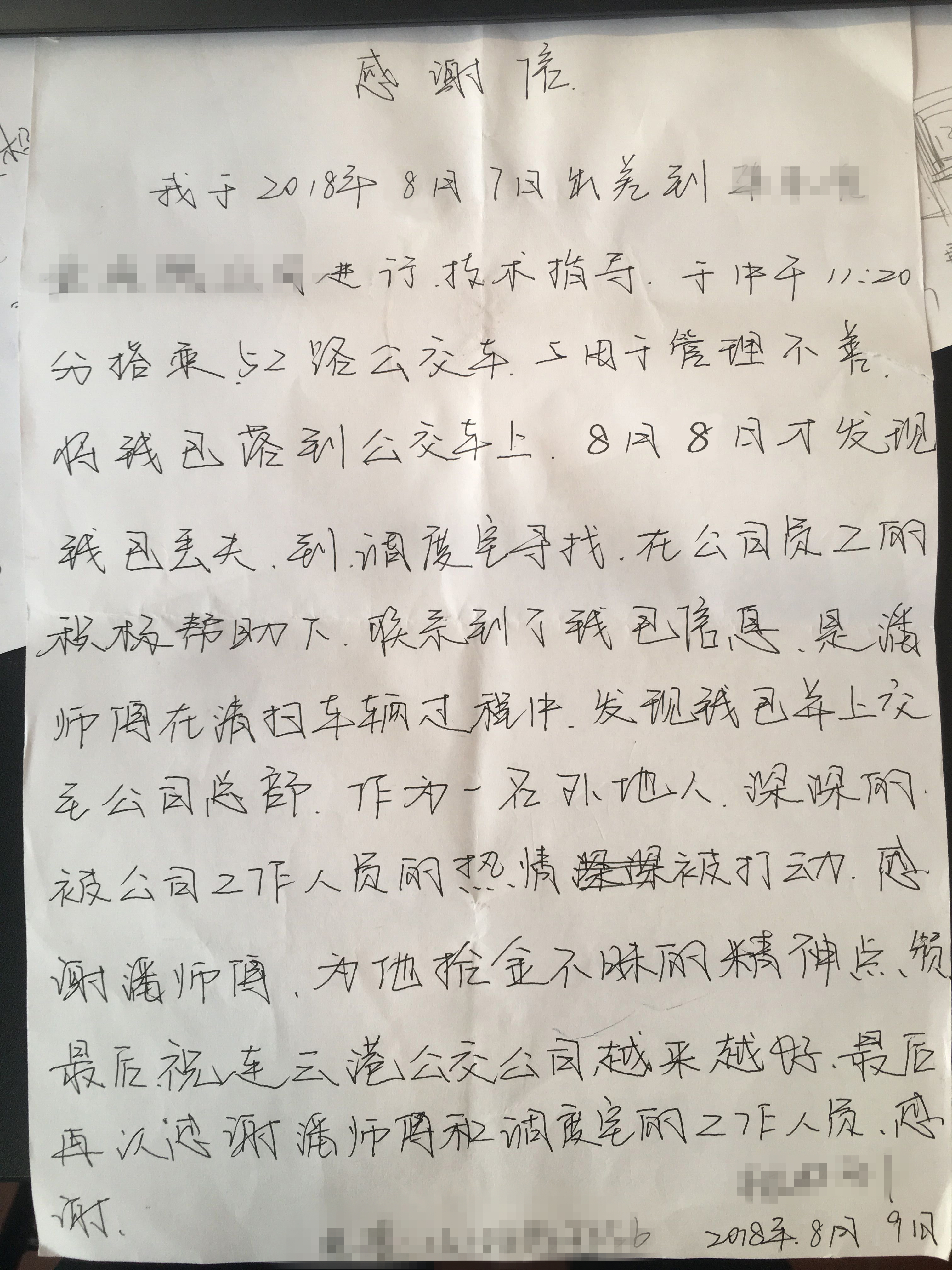 8月9日下午15时左右,失主庞先生赶到车队办公室,经身份核实无误后,顺利领回了丢失的钱包。庞先生表示:作为一名外地人,深深的被公司工作人员的热情打动,感谢潘兆全师傅,并为他拾金不昧的精神而点赞,祝愿连云港公交公司越来越好。近日,庞先生寄来感谢信对驾驶员潘兆全再次表示感谢。