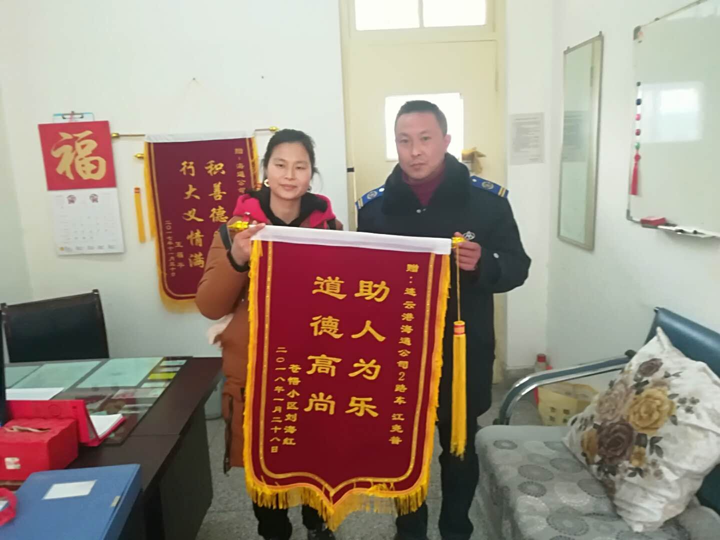 事后,刘女士带着锦旗来到海通公交表谢,锦旗上“助人为乐,道德高尚”八个金灿灿的大字就如同驾驶员金子般的心灵一样让人心生敬意。据刘女士叙述,当天她是给在华杰上学的孩子送冬衣的,骑电瓶车的时候很小心的,但是就不知道怎么的就摔了,而且再想爬起来却怎么也起不来,路过车辆都不敢停,真有叫天天不应,叫地地不灵的感觉,幸好有江师傅这样的好人,帮我扶了起来,我的心里很温暖,让我感受到了来自社会的温暖,我们全家都会向江师傅学习,多做好事回报社会。