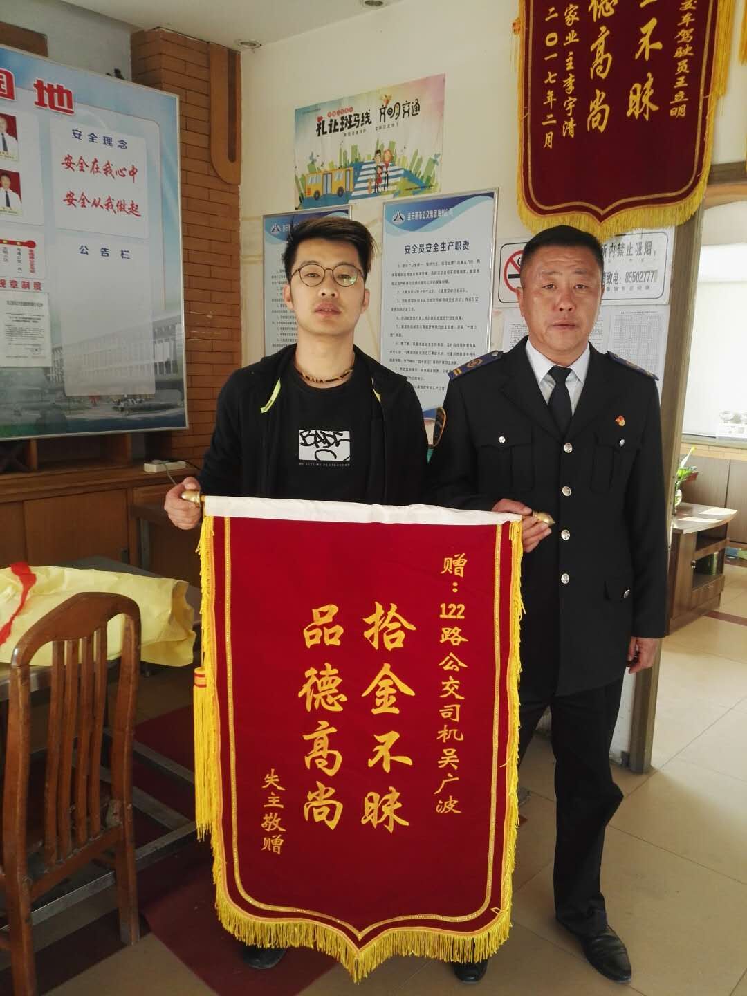 次日,秦先生特地送来一面写有“拾金不昧,品德高尚”烫金大字的锦旗,感谢吴广波师傅拾金不昧的高尚品质。