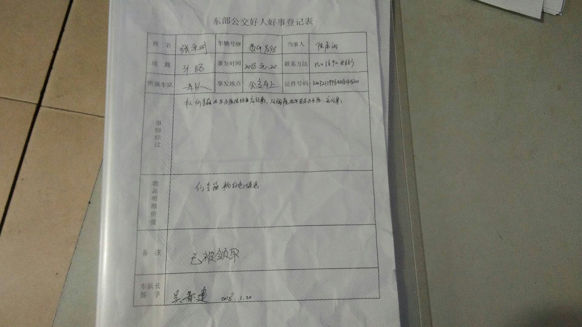 1月20日,乘客程先生乘坐公交31路苏G9298E车时,下车不慎将行李箱丢失在车上,驾驶员张永明到站打扫卫生时发现行李箱并及时交到车队。程先生当时发现自己行李箱丢失后,通过多方打听也及时找到车队,经过身份验证后,车队及时将行李箱归还给程先生。程先生领取行李箱后,对驾驶员张师傅表示感谢,感谢工作人员的热心帮助。