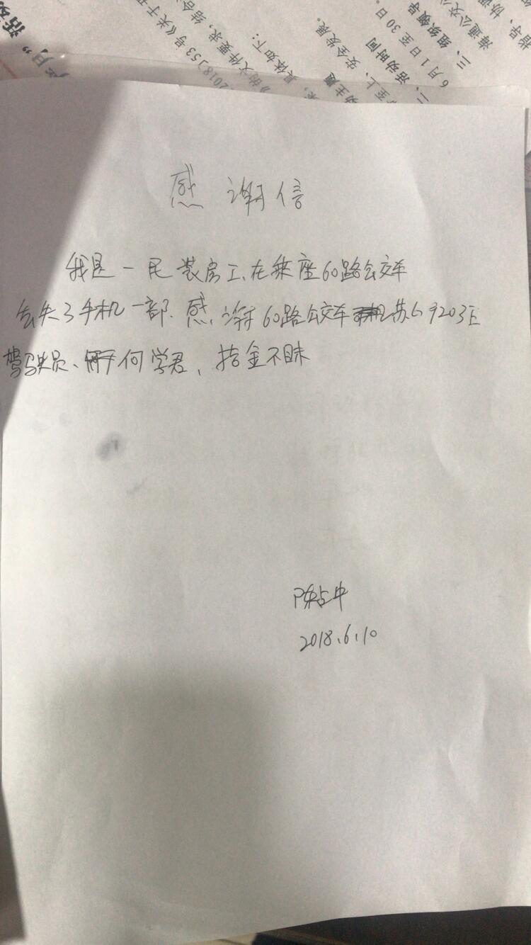 驾驶员何学君驾驶车辆回到停车场,在打扫卫生时发现后排座位上有个一部手机,捡起后立即交至分公司办公室。经分公司值班人员与公交服务热线联系后,陈先生于当日下午顺利取回了手机,并送上自己手写的感谢信,感谢公交驾驶员拾金不昧的高尚品质,为他挽回了损失。