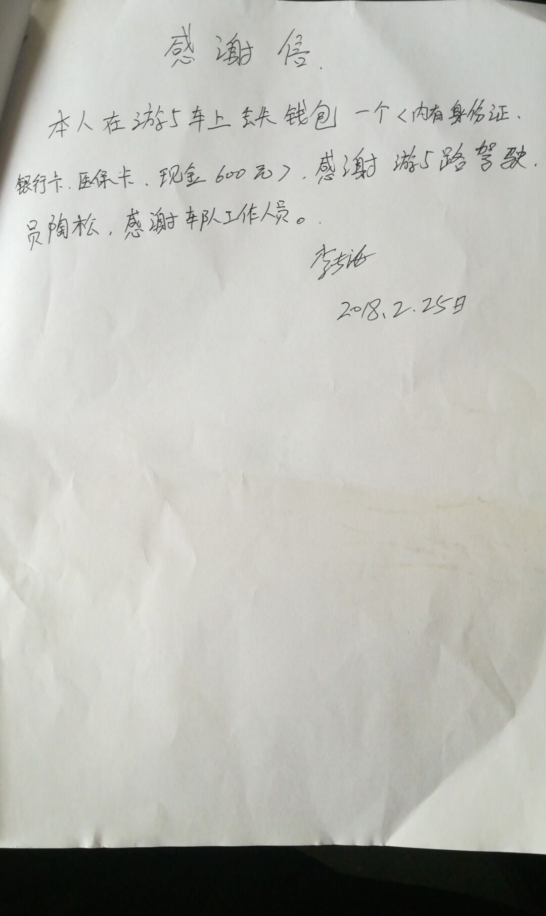 2月25日,乘客李先生乘坐公交游5路苏GM8056车时,因下车匆忙不慎将钱包(包内有银行卡,医保卡,现金600元等)遗失在车上,驾驶员陶松到站打扫卫生时发现了该钱包并及时上交至车队。乘客李先生经过多方寻找后来到公交华亿app最新版下载,华亿(中国)东部公司,得知丢失的钱包在公交公司时,他十分激动,当场写下了感谢信,对驾驶员陶师傅及车队工作人员表示万分感谢。