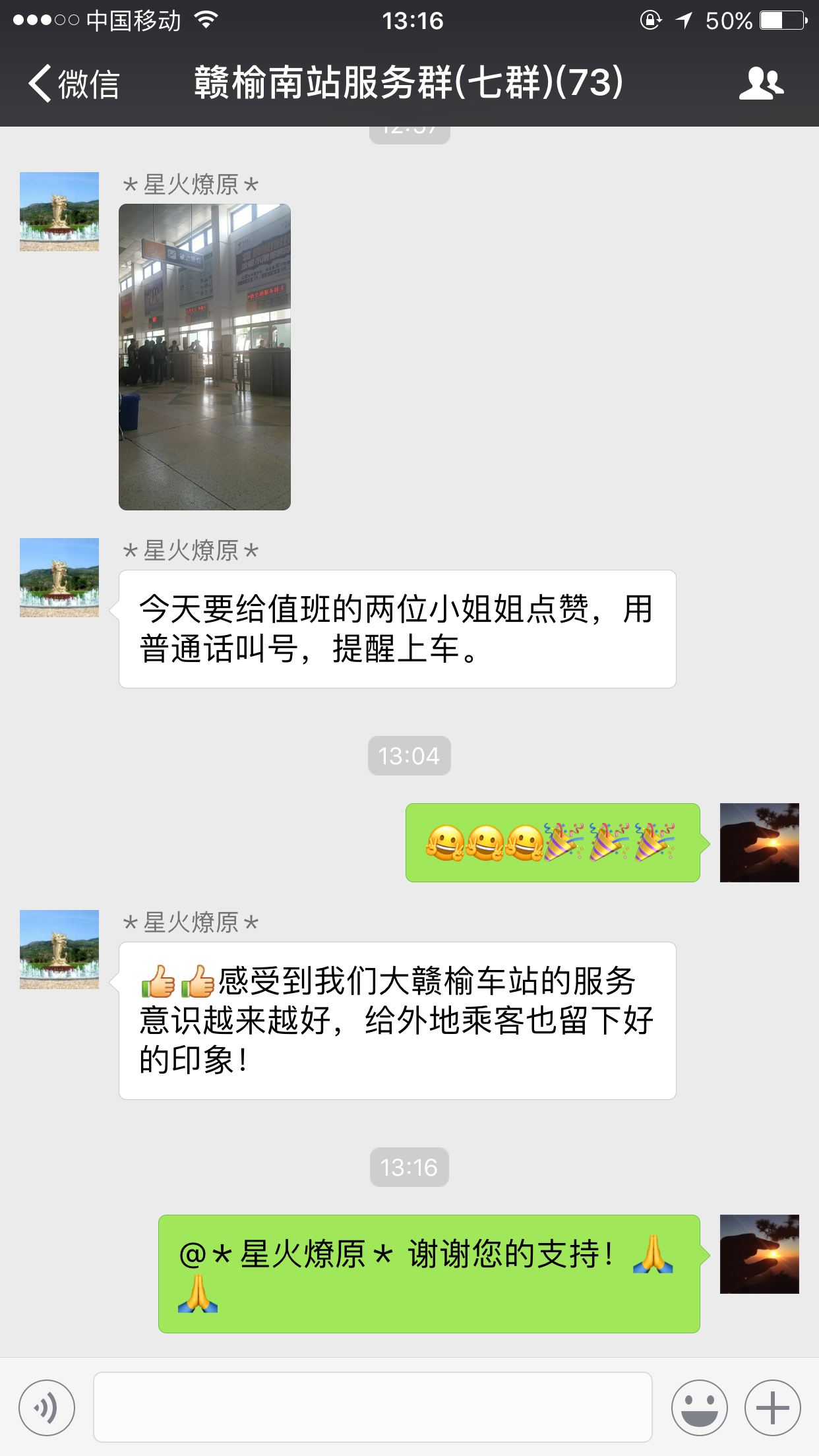 5月23日下午13:00左右,赣榆车站微信服务群内有一位网名叫“星火燎原”的旅客发了张照片并说道:今天要给值班的两位小姐姐点赞,用普通话叫号,提醒上车。群内的管理人员看到后,对旅客的赞许表示感谢。这位网友又说道:赞,感受到我们大赣榆车站的服务意识越来越好,给外地乘客也留下好的印象!收到旅客的赞扬后,群内管理人员第一时间将信息转发到站务工作群内,经过了解,旅客口中的“小姐姐”是站务员仲星晓。从赣榆公司班组建设创建以来积极推进站务管理规范化、制度化,功夫不负有心人,赣榆公司在日常工作中坚持的规范服务得到了旅客们的认可,这也是赣榆公司优良传统的一种体现。