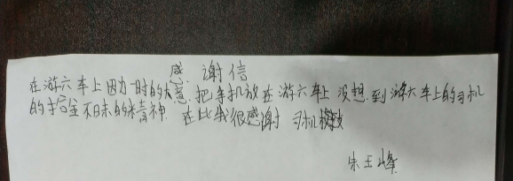 近日,乘客朱先生乘坐公交游6路苏GA0068车时,因下车匆忙不慎将VIVO手机丢失在车上,驾驶员徐刚到站打扫卫生时发现手机并及时交到二分公司,经过二分公司管理人员和驾驶员的多方努力,终于联系到失主朱先生,朱先生领取手机后,当场写下感谢信对驾驶员徐刚师傅表示感谢,感谢驾驶员徐刚拾金不昧,感谢工作人员的热心帮助。