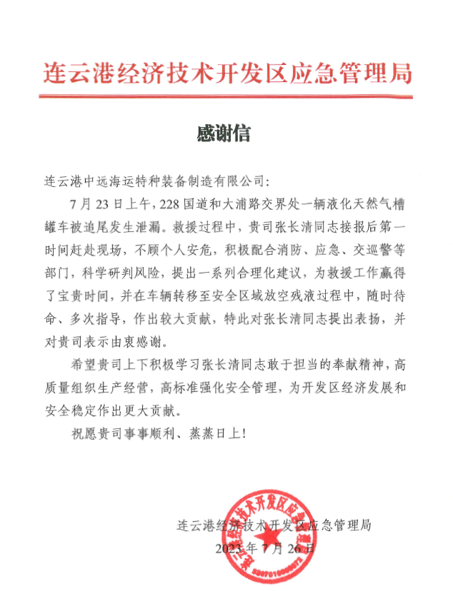 近日,市开发区应急管理局代表到市交通控股华亿app最新版下载,华亿(中国)权属物流华亿app最新版下载,华亿(中国)合资的中远海运特种装备制造有限公司,将一封感谢信送交公司副总经理张长清手中,感谢张长清积极配合消防、应急、交巡警等部门处理228国道和大浦路交界处发生的液化天然气槽罐车被追尾泄露事故。号召公司上下积极学习张长清敢于担当的奉献精神,高质量组织生产经营,高标准强化安全管理,为市开发区经济发展和安全稳定作出更大贡献。