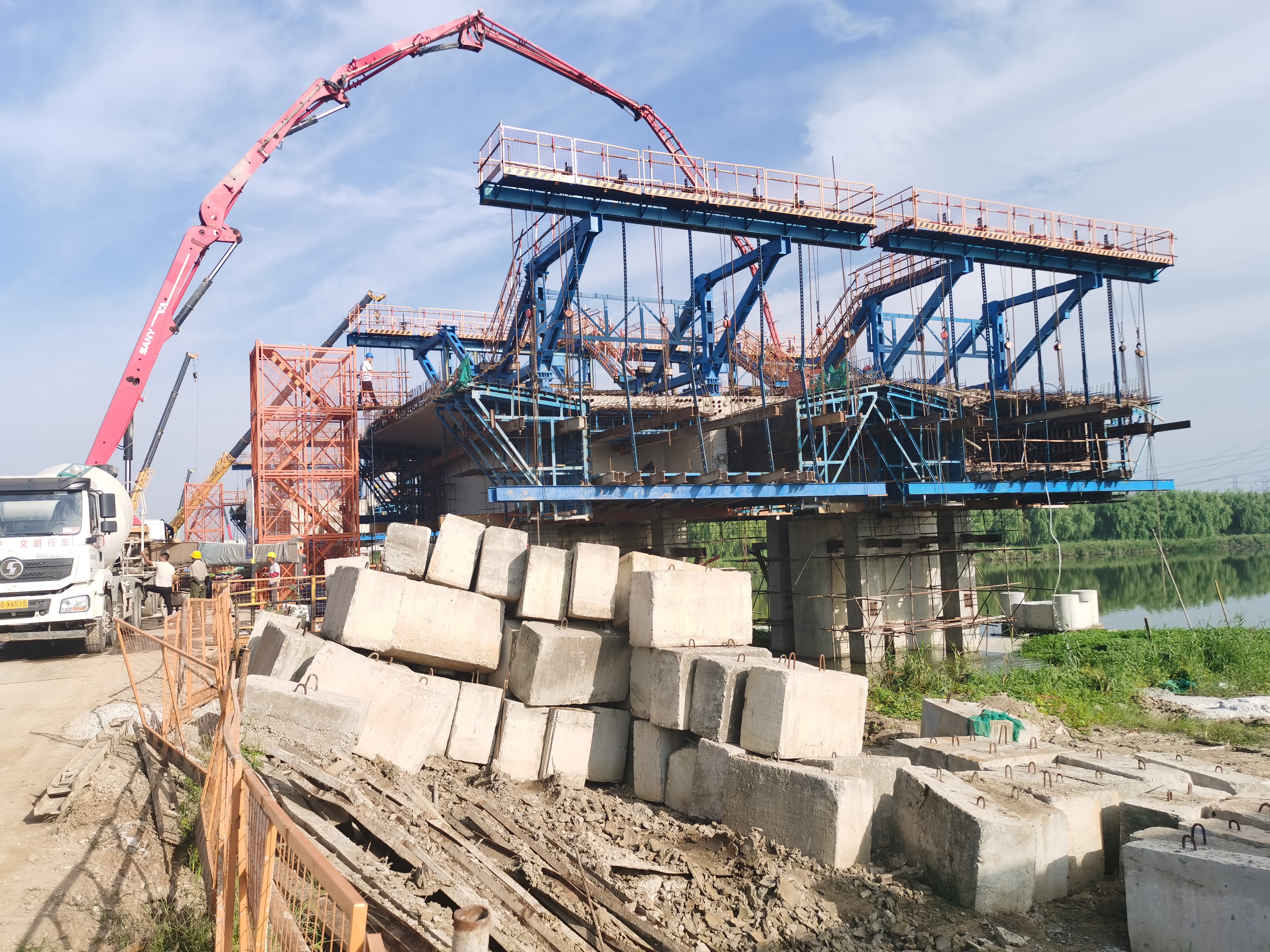 日前,在402省道赣榆南环段项目施工现场,机声隆隆,工人们穿梭往来,正在紧密进行7#主桥右幅1#节段的浇筑施工。