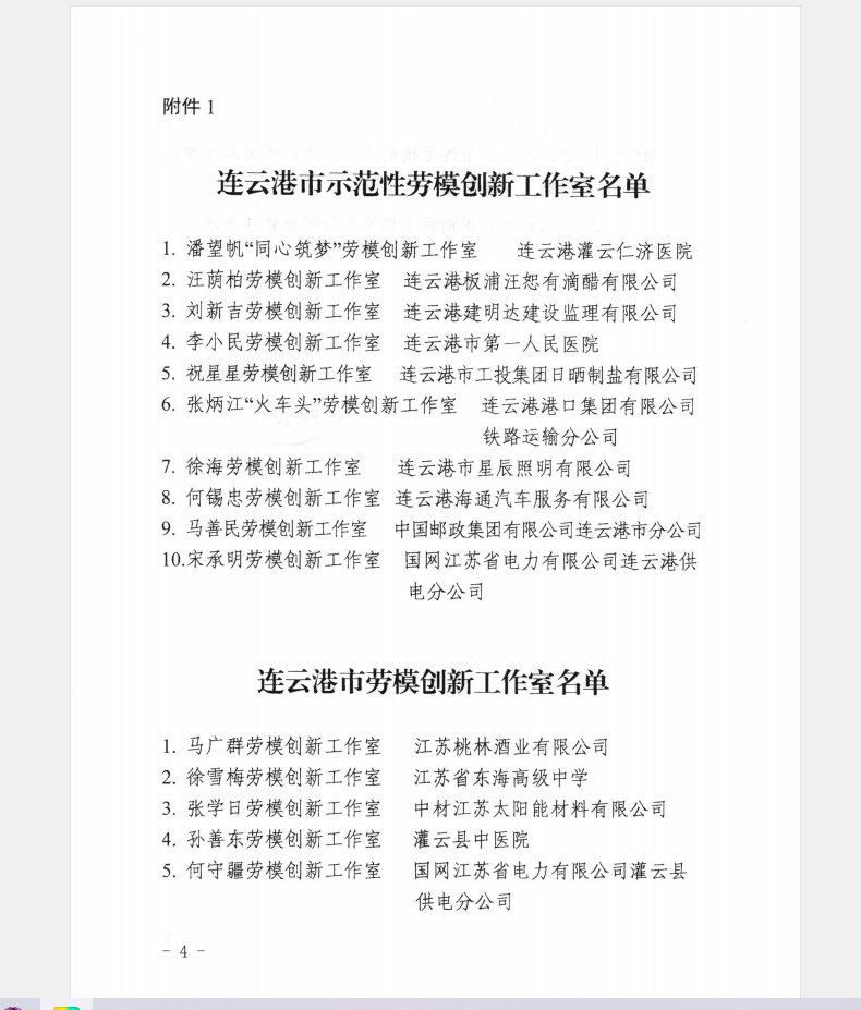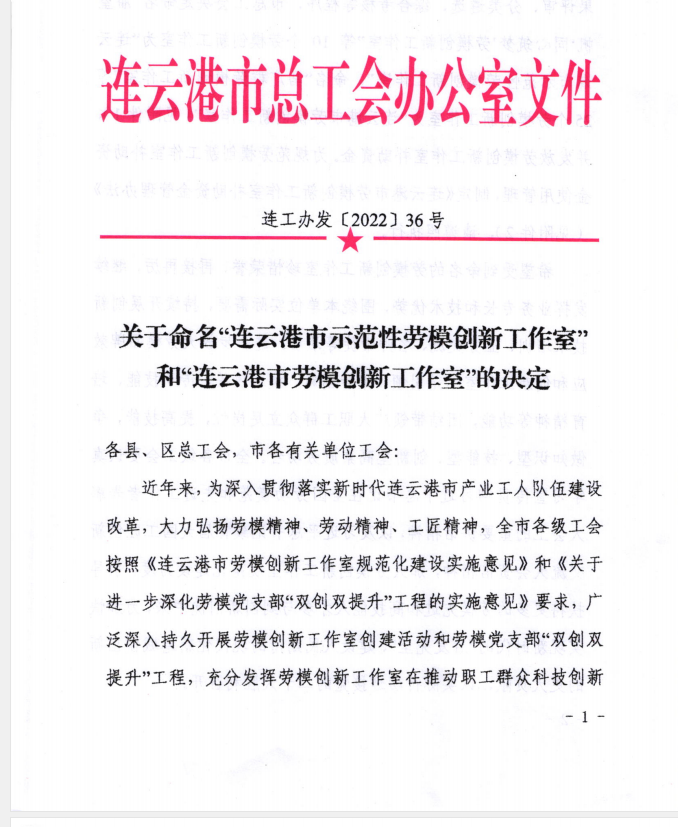 由于劳模何锡忠在汽车喷涂行业中取得的优异成绩,2022年6月份,经基层工会申报、成果评审等程序,“何锡忠劳模创新工作室”被连云港市总工会命名为“连云港市示范性劳模创新工作室”。