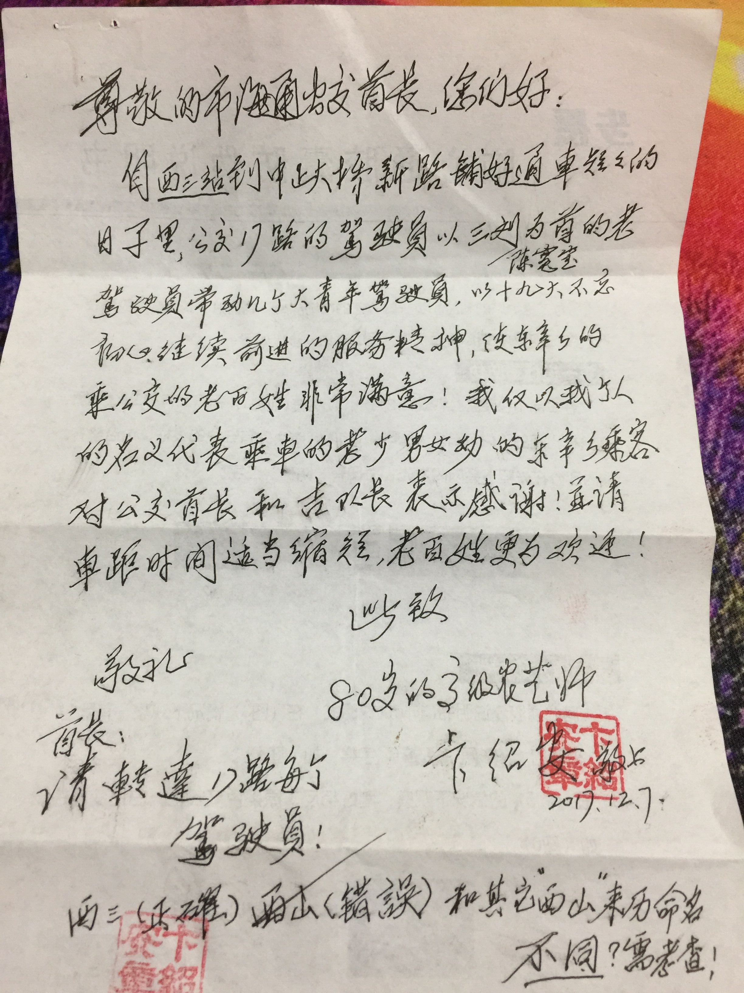 12月11日,公交华亿app最新版下载,华亿(中国)新浦公司收到一封乘客来信,写信人是一位80岁的高级农艺师,名叫卞绍安。他在信中写道“17路在驾驶员陈宽宝师傅的带领下,全线驾驶员服务热情周到,视乘客为家人,坚持以十九大“不忘初心,继续前进”的服务精神严格要求自己,做好服务工作。”
