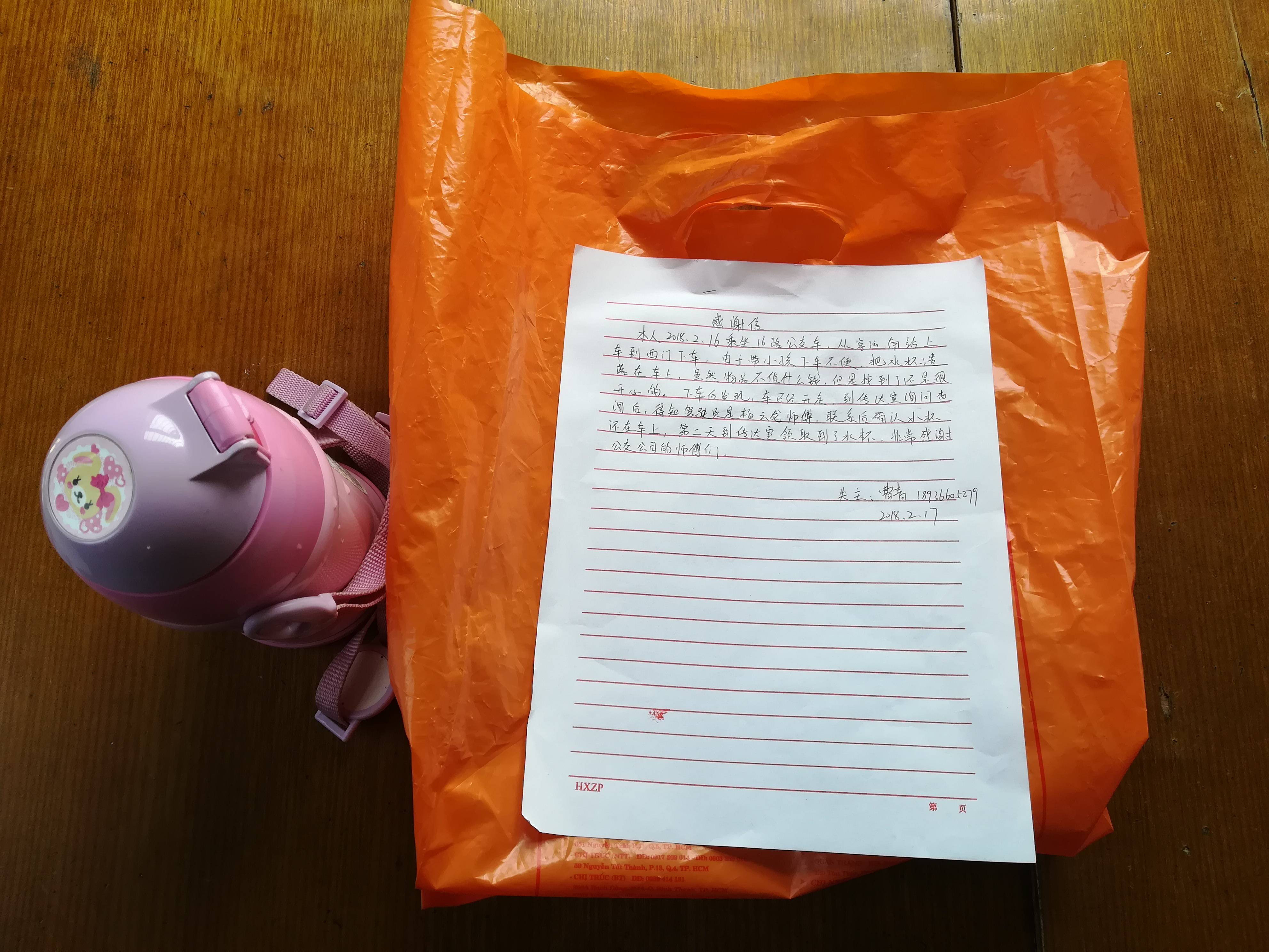 据了解,曹女士前一天在客运南站乘坐16路公交车到海州医院站下车,下车的时候由于只顾着带孩子,一时疏忽将自己随身携带的一个手提袋丢在了座位上,袋中有一个水杯、书本等物品。丢失的水杯是孩子最喜欢的杯子,平时一直在使用,孩子发现杯子丢失一直闹着妈妈寻找,于是曹女士抱着试一试的心情来到西门车站里询问,没想到丢失的手提袋已经被16路驾驶员杨云龙捡到放在了西门调度室妥善保管了。手提袋里的儿童水杯和一些零食物品,虽然不是什么值钱的东西,但是对自己来说是孩子的物品就有着非常的意义。曹女士当场写下了一封感谢信,感谢16路车驾驶员杨师傅拾金不昧的精神,为公交华亿app最新版下载,华亿(中国)驾驶员过年期间无私奉献服务广大乘客的奉献精神点赞。