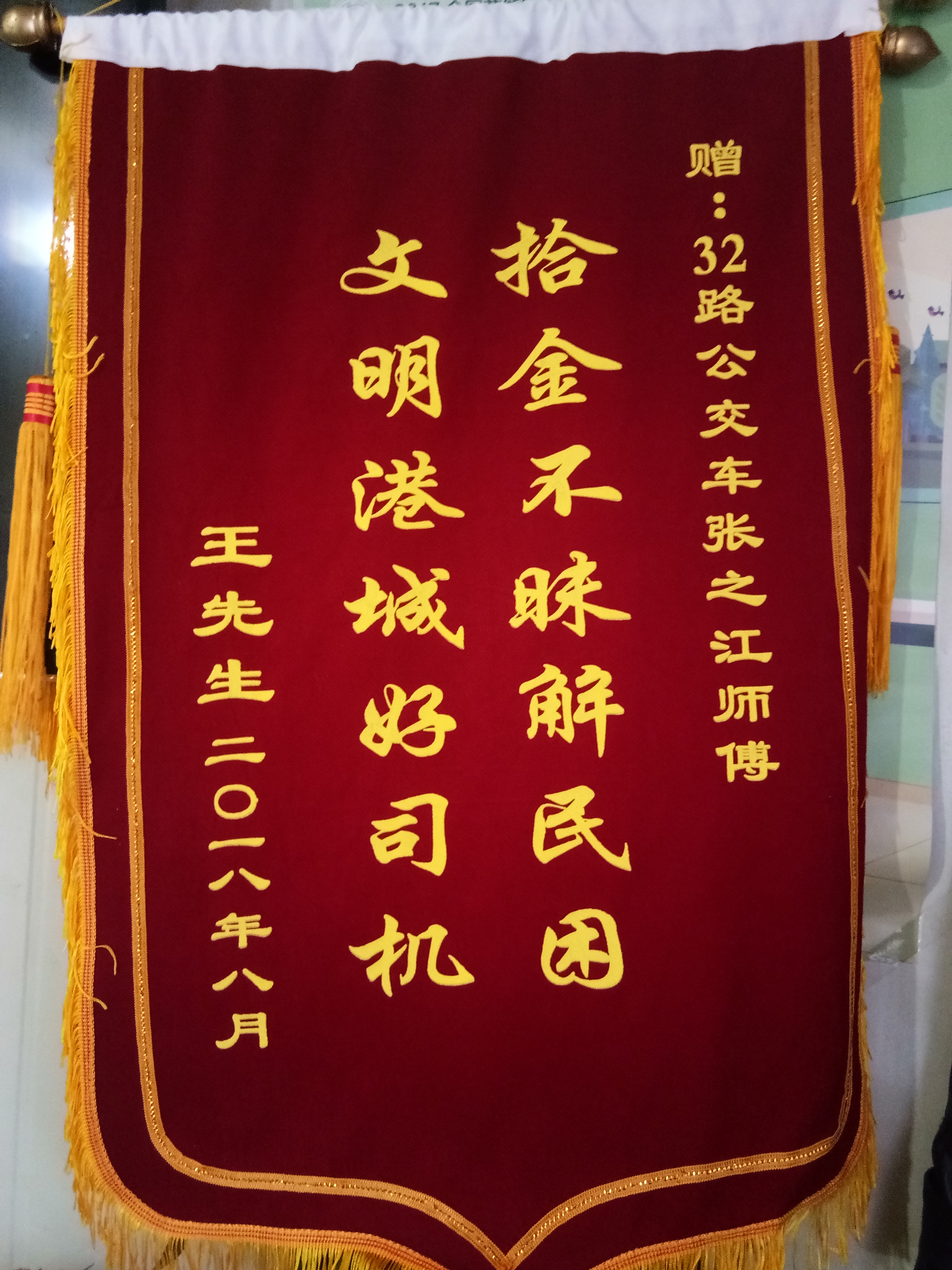 8月15日,公交华亿app最新版下载,华亿(中国)东部公司一分公司办公室收到一面锦旗,工作人员有点诧异,因为最近未接到张之江师傅的相关好人好事。此时,送锦旗的王先生向工作人员说明了原由,原来,前段时间,王先生乘坐张之江驾驶的32路苏GA9172车至大巷生活区,因下车匆忙不慎将钱包丢失在车上,但是王先生一下车就发现了自己丢失了钱包,好在是终点站,车子还未开走,所以他立即前往车上问询,而恰巧驾驶员张之江师傅正拾起钱包,正准备向公司工作人员反映此事,所以就当场将钱包归还了乘客王先生。张之江师傅觉得这是小事,也是常常发生的事情,而且当场也解决了,所以就未向公司提起此事,加之王先生工作忙,他本想亲自感谢张之江师傅,所以时隔近一月的时间才将锦旗送到公司,锦旗上写的“拾金不昧解民困 文明港城好司机”是对张之江师傅的最美赞扬。