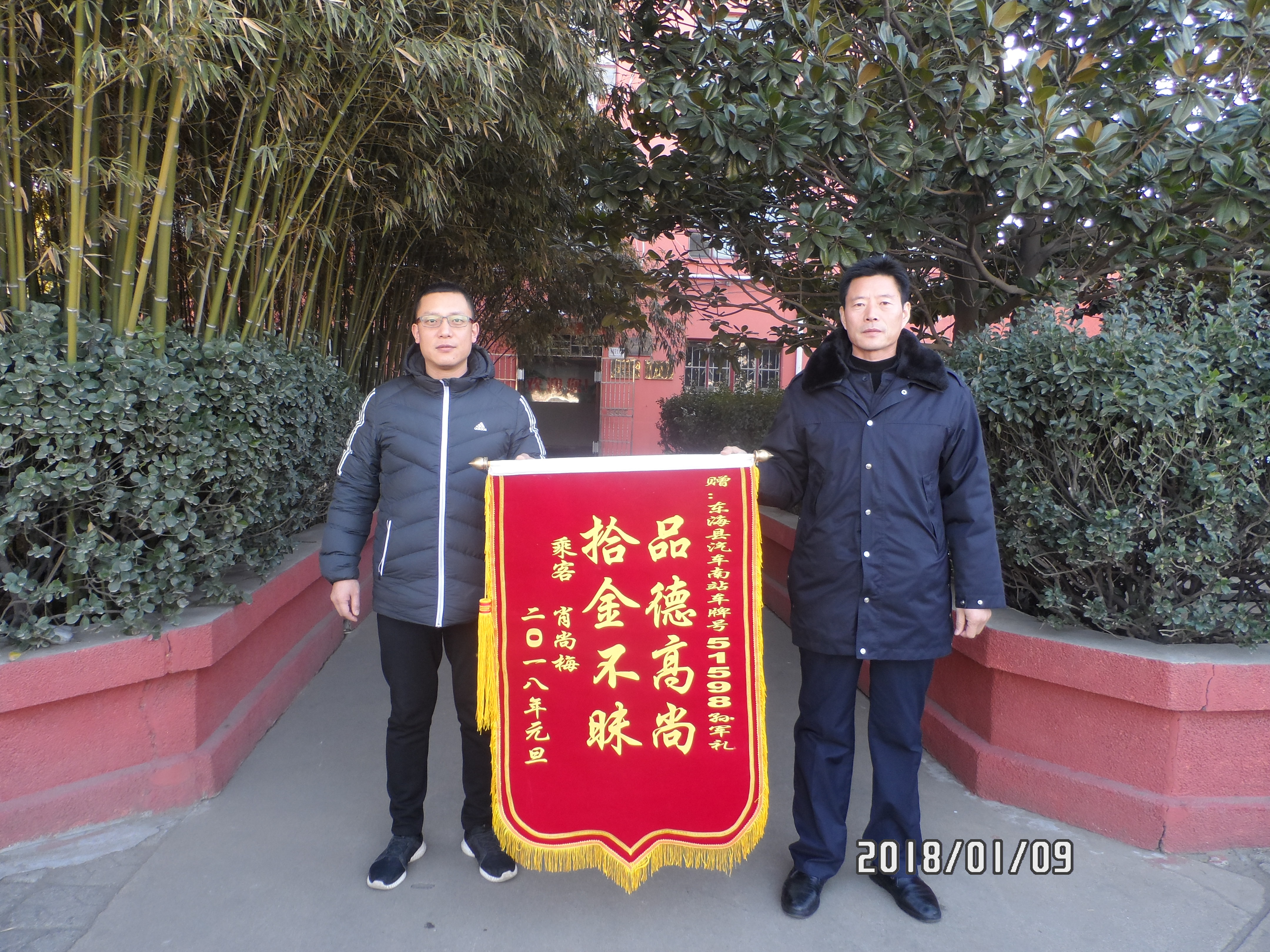 2018年1月1日上午,东海至市区班线公营车驾驶员孙军礼,在驾驶苏G51588号客车到达苏欣站打扫卫生时捡到一只提包,包内装有现金1900余元、手机一部和身份证件等钱物。孙军礼根据身份证信息经多方查找,于当日下午联系到失主肖女士的家人,并将钱物完璧归赵。1月9日上午,肖女士家人将精心制作的“品德高尚,拾金不昧”锦旗送到东海分公司,高度称赞了孙军礼同志的高尚品德和优良作风,并对东海公司培养出这样的优秀驾驶员表示由衷的感谢。
