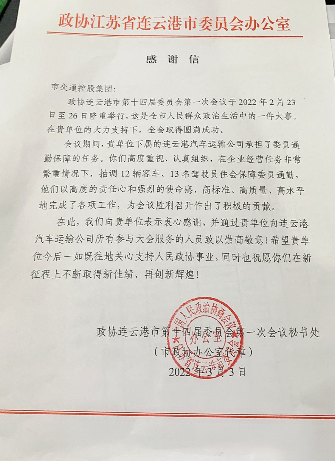 信中写道,汽车公司在承担会议委员通勤保障任务中,高度重视、认真组织,在企业经营任务非常繁重的情况下,抽调12辆客车、13名驾驶员住会保障委员通勤,以高度的责任心和强烈的使命感,高标准、高质量、高水平地完成了各项工作,为会议胜利召开作出了积极的贡献。