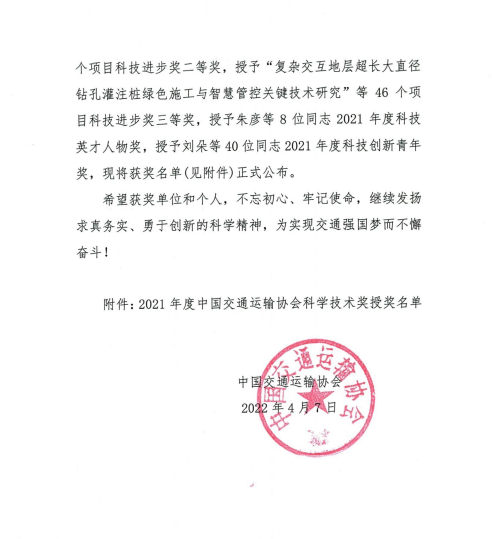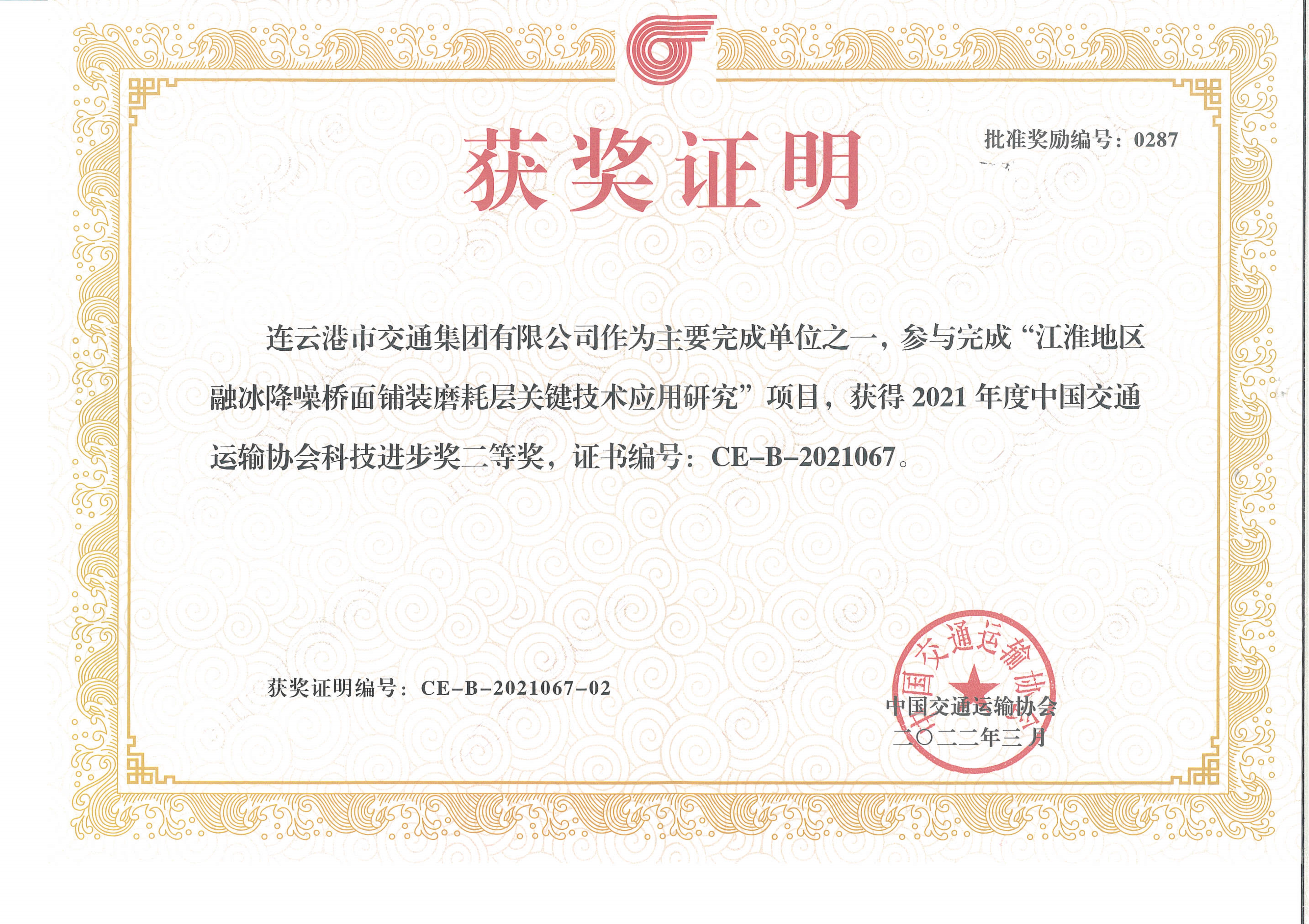 近日,中国交通运输协会发布了“2021年度中国交通运输协会科学技术奖”获奖项目名单,交通华亿app最新版下载,华亿(中国)联合苏交科华亿app最新版下载,华亿(中国)等单位申报的“江淮地区融冰降噪桥面铺装磨耗层关键技术应用研究”项目荣获中国交通运输协会科技进步奖二等奖。