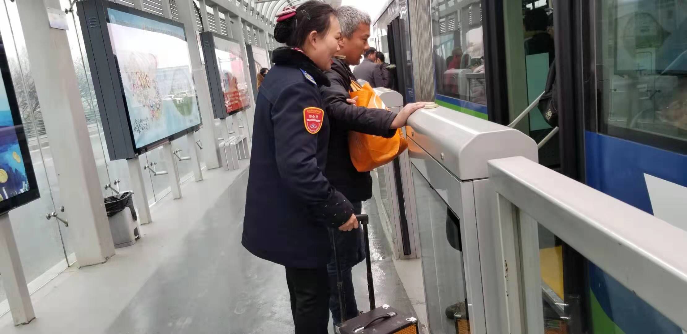 稽查人员在客流密集站点疏导乘客