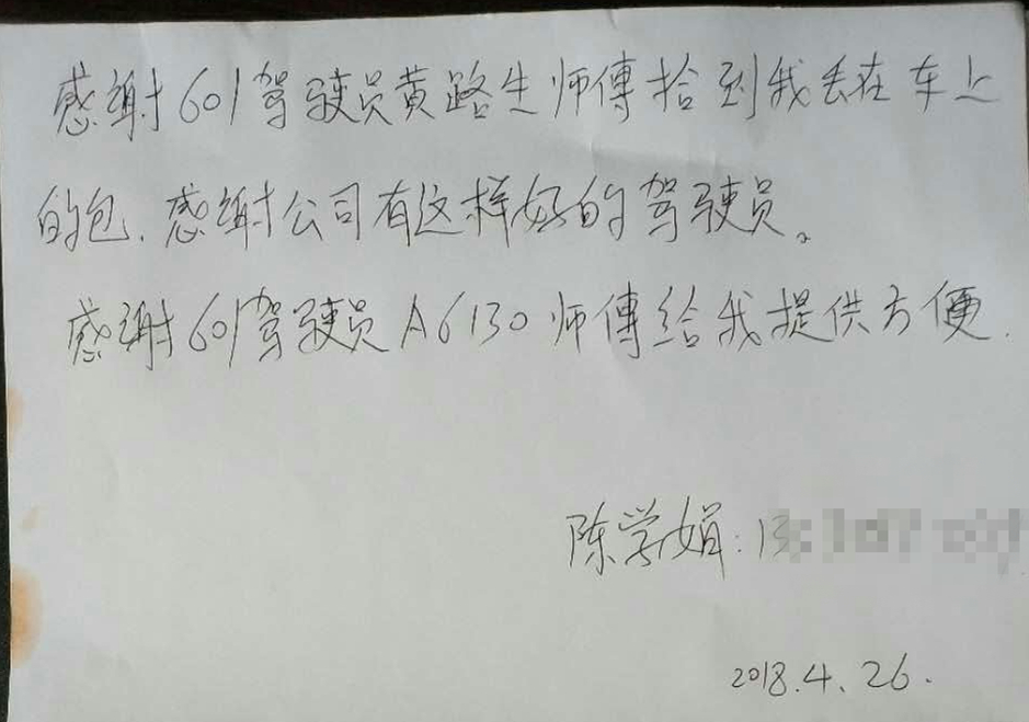 4月26日,乘客陈女士乘坐公交601路苏GA6120车时,因下车匆忙不慎将手包丢失在车上,公交华亿app最新版下载,华亿(中国)东部公司驾驶员黄路生到站打扫卫生时发现手包并及时交到二分公司办公室,经过二分公司管理人员和驾驶员的多方努力,终于联系到失主并通知失主到二分公司领取包。陈女士来到二分公司,经核实身份后,二分公司经理把包归还给失主陈女士。陈女士领取包后,为表示对驾驶员黄路生师傅的感谢,当场写下感谢信,感谢驾驶员黄师傅拾金不昧的精神,感谢工作人员的热心帮助,同时感谢公交公司培养这种品质高尚的人!