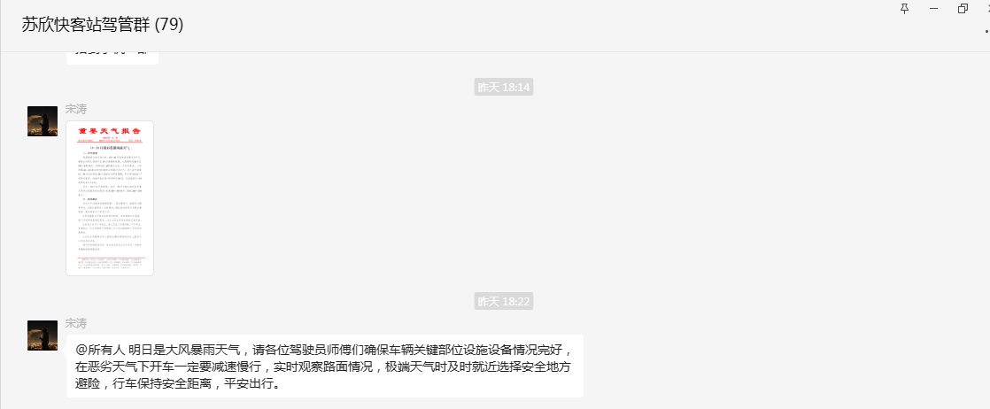 公司各客运站站场通过电子显示屏、公告栏及微信群等消息渠道发布恶劣天气告示,提醒广大驾驶员密切关注天气动态,出车前认真检查车辆安全状况,消除安全隐患,雨天道路湿滑,保持安全行车距离,不急刹车急加速、不疲劳驾驶;要求禁止闯行洪水、险桥及坍塌路段,做到“一停、二看、三通过”,确保旅客生命与财产安全。对于行程较远的班车,还要求备好食品和饮用水,以应对公路堵塞时的应急需要,确保旅客运输安全。