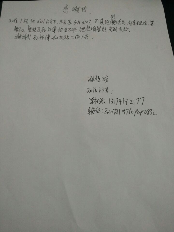 1月3日,乘客程先生乘坐公交601路苏GA6107车时,下车不慎将背包(包有现金900元,身份证,银行卡等)丢失在车上,驾驶员到站打扫卫生时发现手提包并及时交到车队,车队通过车辆智能调度系统寻找失主,经过车队管理人员和驾驶员的多方努力,终于联系到失主并通知失主到车队领取手提包。程先生来到车队,经核实身份后,车队当场把背包归还给失主程先生。程先生领取包后,对驾驶员孙勇师傅表示感谢并写下感谢信,感谢驾驶员孙勇师傅拾金不昧的精神,感谢工作人员的热心帮助。