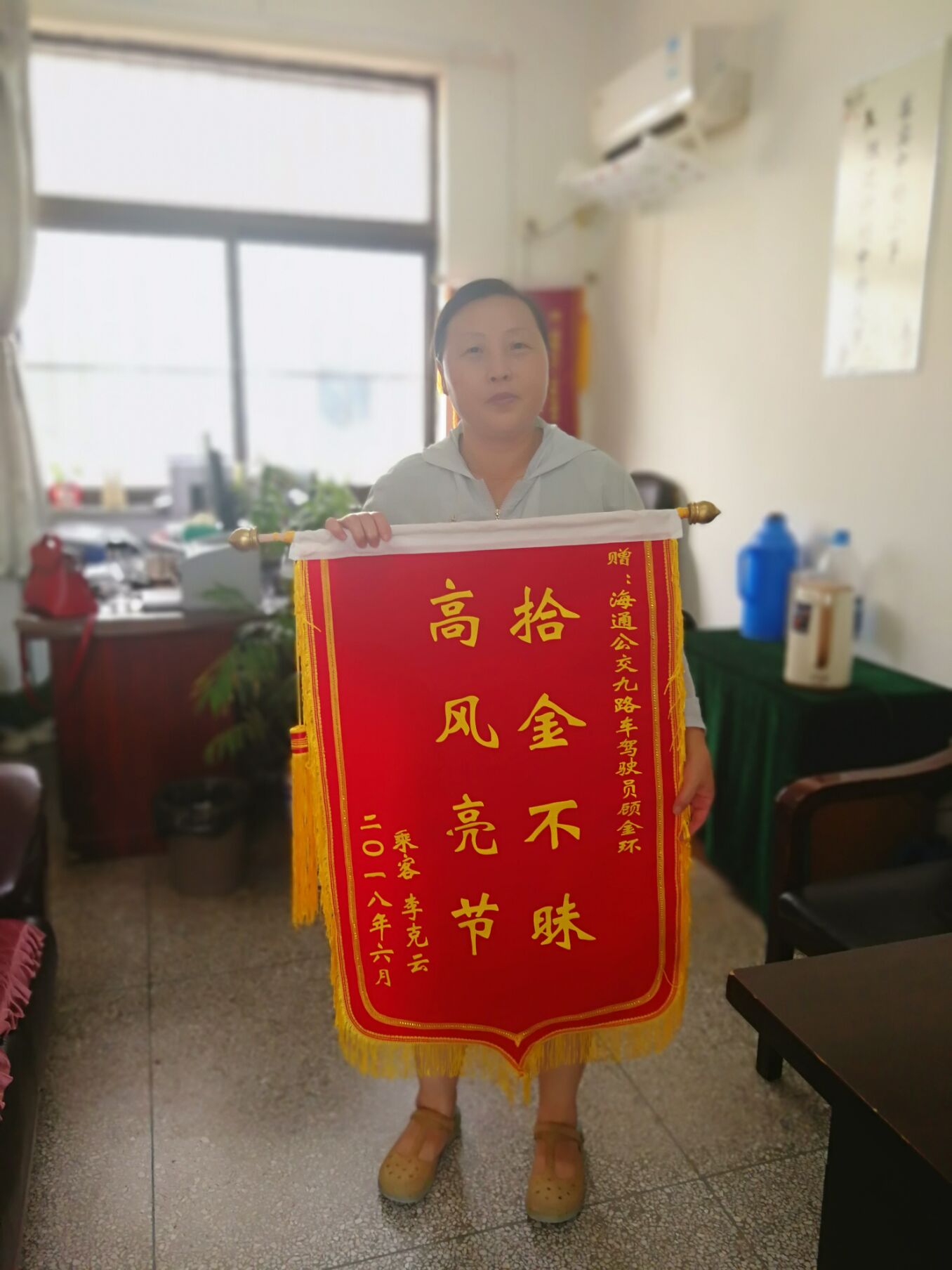 据李女士讲述,20日她在大润发转乘9路公交车回家,因随身带的行李太多,加上又抱着孩子,下车时不慎将钱包遗忘在了车上。丢失的5000元现金是她两个月的工资,准备用来还账,钱包内的贵重首饰是老公刚送的礼物,很有纪念意义。李女士万分着急,本以为钱包是遗忘在了5路车上,打车追了两辆5路车都未找到,心里渐渐产生了放弃的念头。就在此时,她通过服务热线得知钱包被9路驾驶员顾金环师傅捡到并妥善保管,心情激动万分。