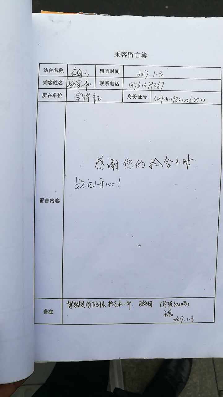 据了解,失主孙女士从外国语站乘坐车号为苏G-28158的班车在购物中心站下车时,由于手里拿的东西太多,下车的乘客也多,她棉衣的口袋太浅以至手机滑至车门口的垃圾桶内也没有发现。当她到公司办公室发现手机丢失后,也非常着急,并往自己手机打电话,当得知手机已经被尚师傅捡到后放置在站台时,不由得松了一口气。当孙女士到在海一方站领到手机后非常激动,她在乘客留言簿上写道“感谢您的拾金不昧,铭记于心!”