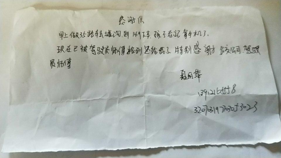 12月24日,乘客夏小姐在乘坐公交35路苏G9273E车到墟沟时,由于下车时匆忙不慎将手机丢失在车上,驾驶员顾汉敏到站打扫卫生时发现手机一部,捡到后及时交到车队,经车队管理人员多方查找并联系到失主夏小姐,夏小姐及时至车队领回丢失的手机,并送来手写的感谢信一份。