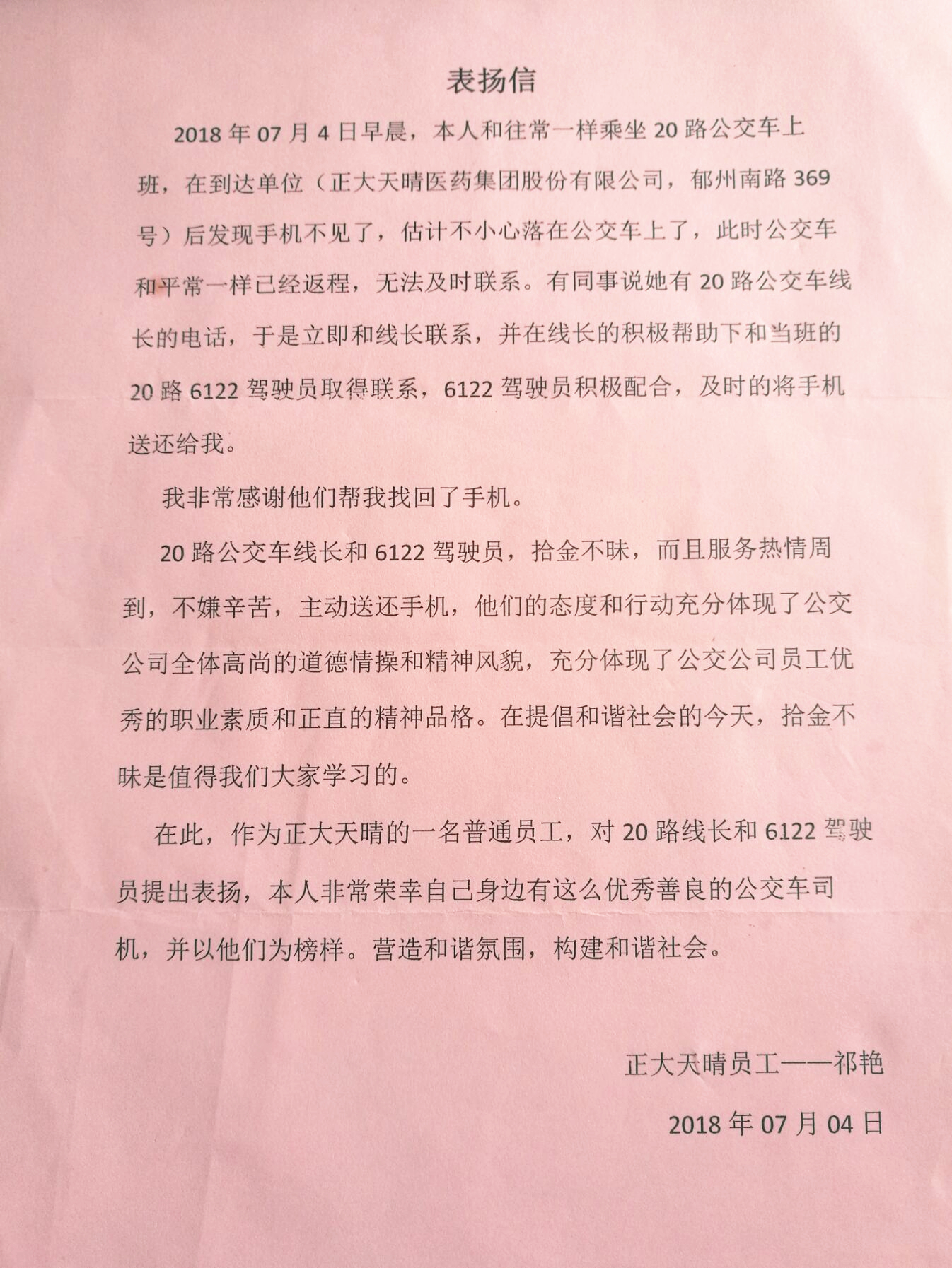 隔日,祁女士托20路驾驶员送来一封表扬信,表达她对公交华亿app最新版下载,华亿(中国)海通公交公司两位驾驶员的感激之情。