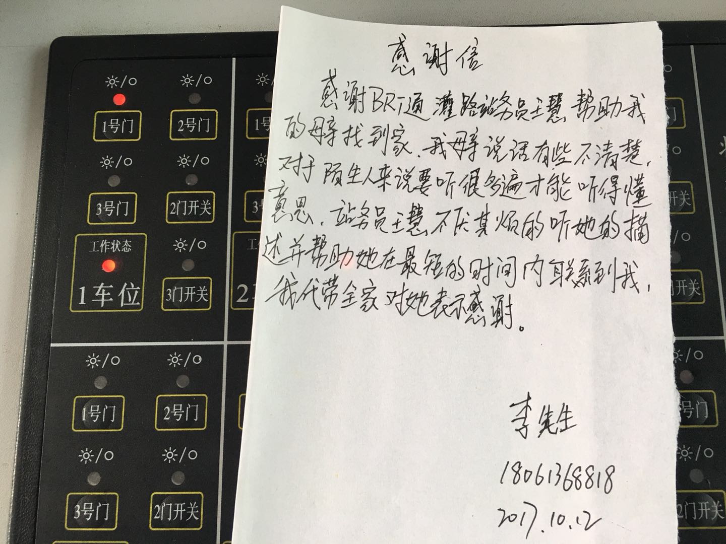 2017年10月11日的晚上,从B12车上下来一位神色慌张,说话不清楚的老人,在我慢慢的询问下得知老人是迷路了。“老人家,您不要慌,有没有家里人的电话号码?我让您的家里人来站台接您”。在等家人来接老人期间,我不断地安抚着他的情绪。不一会,他的儿子过来接她,老人在跟随他儿子离开的时候,一直不停的对我说着说谢谢。第二天,老人的儿子专程送来了一封感谢信,当看到沉甸甸的信件时,我的心里暖暖的。