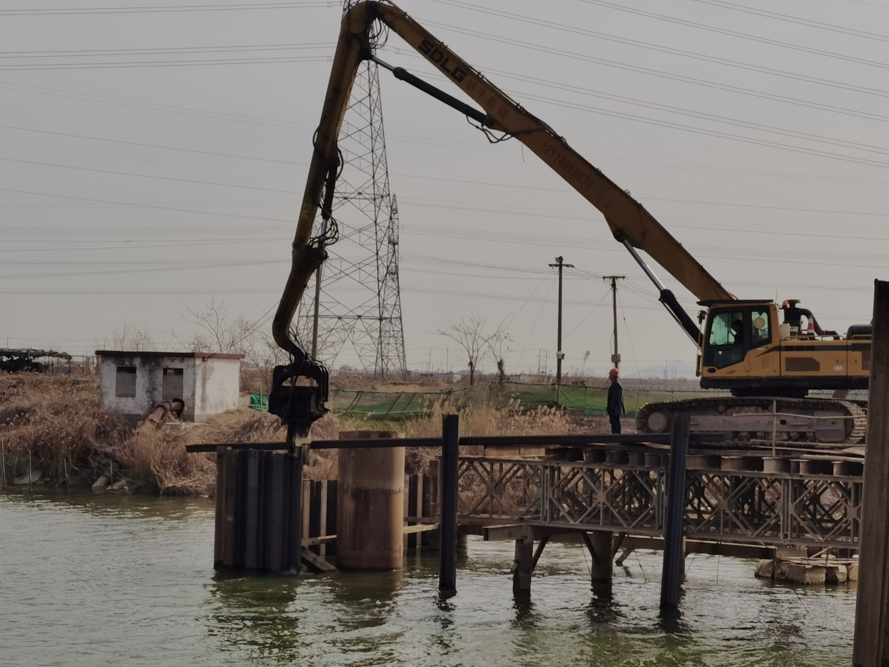 2月20日上午,在402省道赣榆南环段路基桥涵工程施工现场,随着液压震动打桩锤的轰轰作响,水中墩主桥7#墩围堰第一根钢板桩顺利完成插打,这标志着沭北运河大桥主桥施工进入了新的阶段。
