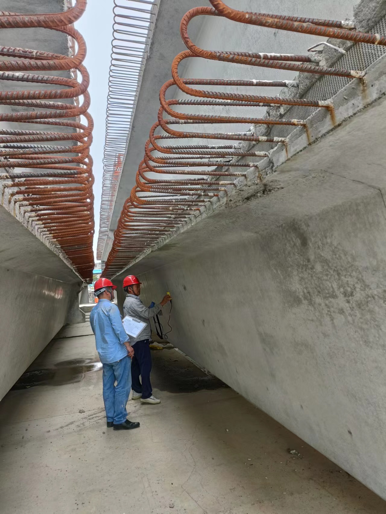 本次检查主要对海州区洪东线X353、浦新线X205(新204-魏口)、海中线X252、浦平线二总桥、板新线磕头桥改建工程中的磕头桥已达28天龄期的箱梁进行抽检。检查内容包括外观、强度、钢筋保护层厚度等各指标。检查小组还抽取了钢筋、水泥、黄砂、石子等原材料带回新丝路检测公司做样品检测,新丝路公司将及时出具《检测报告》,为项目的质量管控提供详实依据。