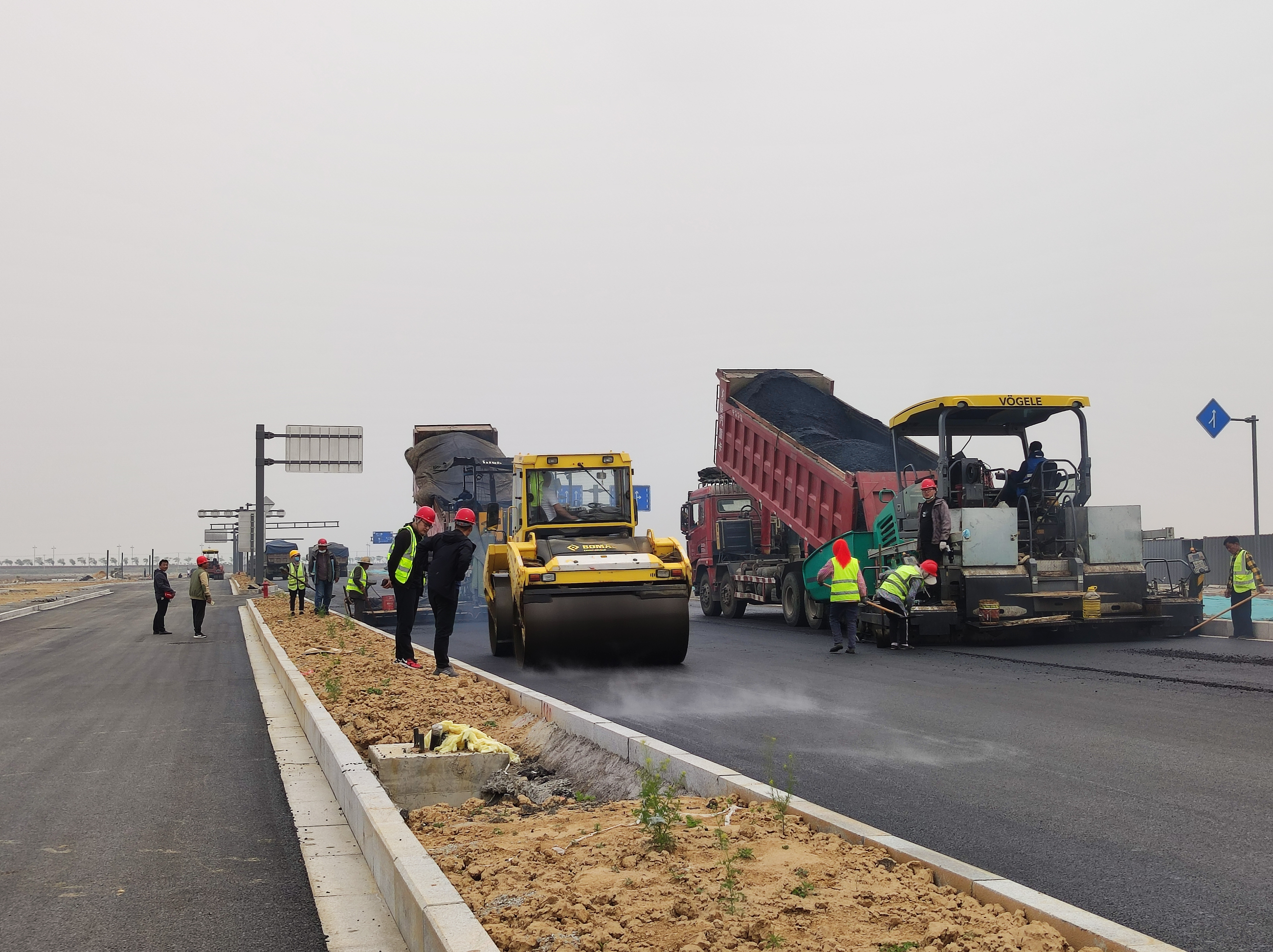 汇晶路项目目前正在进行道路沥青的摊铺,大型压路机、挖掘机、沥青摊铺机等工程机械来往穿梭,施工人员正在对刚刚铺设完的路面进行平整、清理。汇晶路设计标准高,施工工艺要求,建成后,将为周围群众生产、生活的出行提供极大方便。