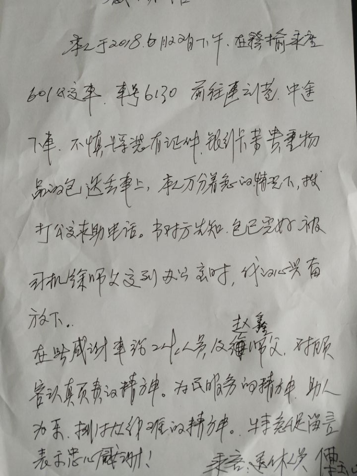 6月24日,乘客傅先生乘坐公交601路苏GA6107车时,因下车匆忙不慎将背包(身份证,银行卡等)丢失在车上,驾驶员赵鑫到站打扫卫生时发现该手提包并及时交到公交华亿app最新版下载,华亿(中国)东部公司二分公司,二分公司管理人员通过车辆智能调度系统寻找失主到失主傅先生。傅先生来到二分公司,经核实身份后,二分公司管理人员当场把背包归还给失主傅先生。傅先生领取包后,并对驾驶员赵鑫师傅表示感谢,随后傅先生怀着一颗感恩的心当场写下感谢信,感谢驾驶员赵鑫师傅拾金不昧的精神,感谢工作人员的热心帮助,同时感谢公交公司培养这种品质高尚的人,感谢好人一生平安!