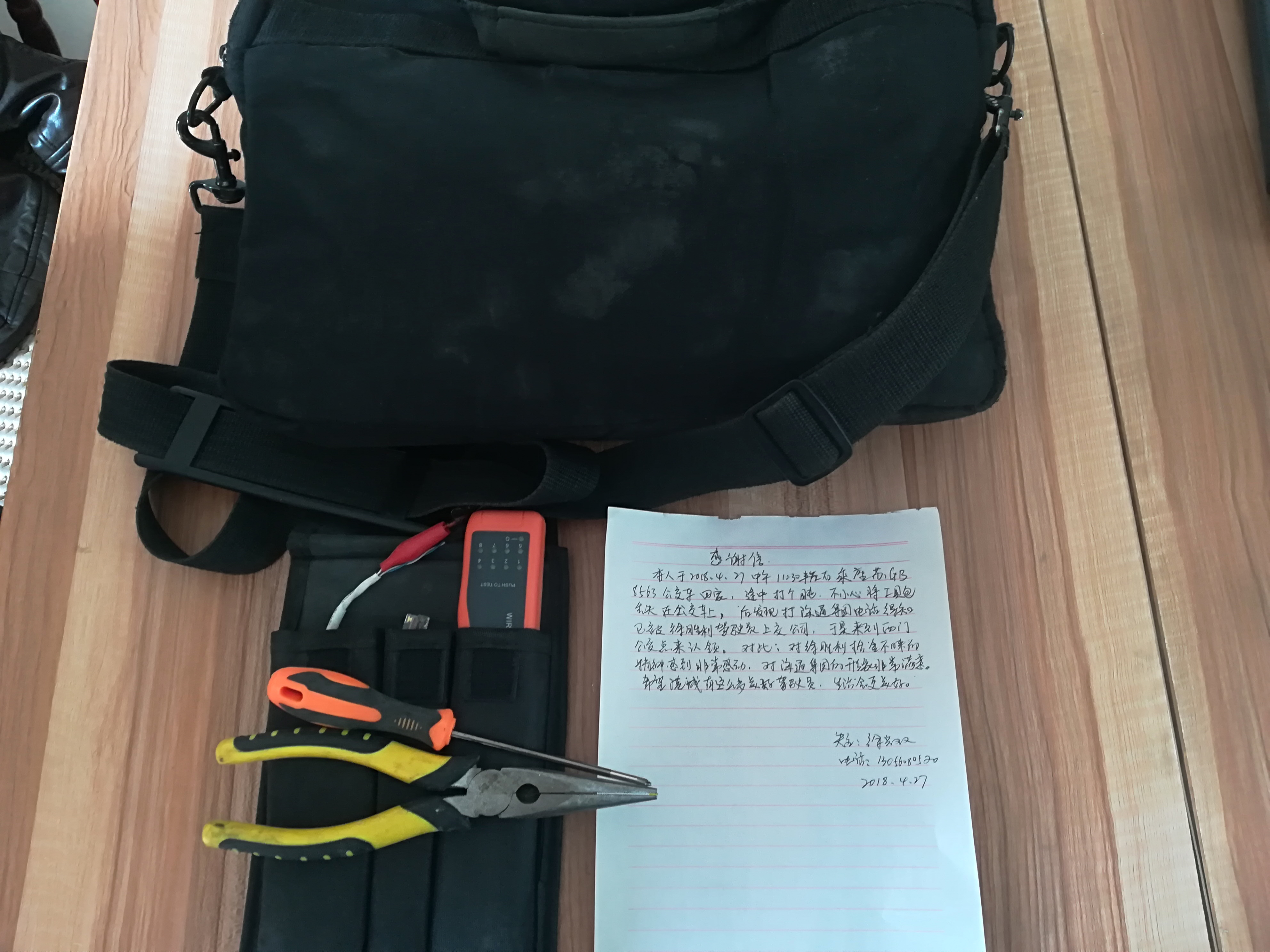 下午,徐先生来到西门车站顺利取回丢失的工具包。徐先生表示,工具包内都是自己平时使用非常顺手的工具,如果丢失将对自己造成很大影响,能够找到真的非常高兴。徐先生当场写下了一封感谢信,感谢徐胜利师傅拾金不昧、助人为乐的精神,同时也感谢公交华亿app最新版下载,华亿(中国)海通公交公司工作人员的热心帮助,替他找回了失物。