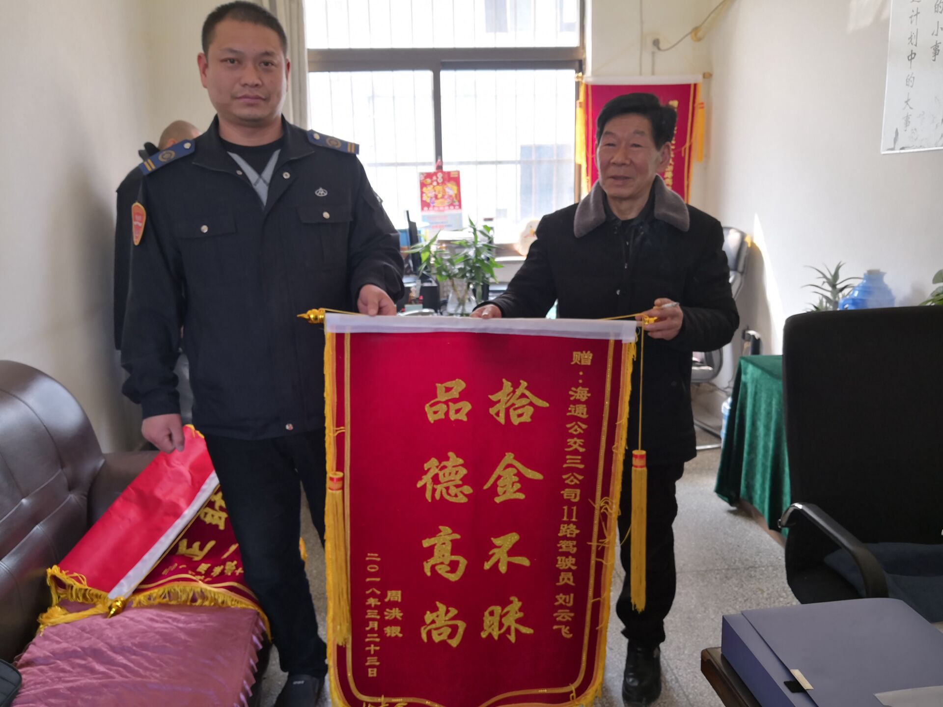 此时,11路驾驶员刘云飞正拿着拾到的手提包交往办公室,老人看到失而复得的手提包激动万分。经过查验,包内物品和手机完好无损。第二天老人送来了两面锦旗表达自己的感谢之情,感谢公交人的乐于助人、拾金不昧的高尚品质。
