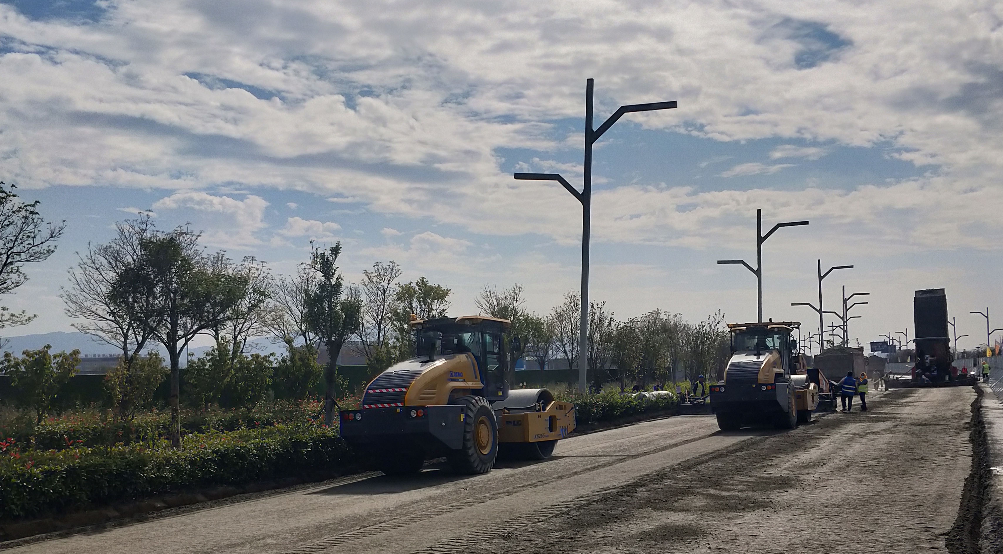 为推进项目建设顺利进行,项目部高度重视,积极组织施工力量、配备人员设备,倒排工期,确保了工程施工质量,施工周期。在施工中,为确保水稳及沥青层的顺利铺设,项目部从技术、人员、设备、现场管理等方面科学组织,细化现场管理工作,对现场操作人员进行详细分工,责任到人。严把原材料进场关,严控水稳混合料的拌合、运输、摊铺、碾压、检测、养生等各个环节施工。