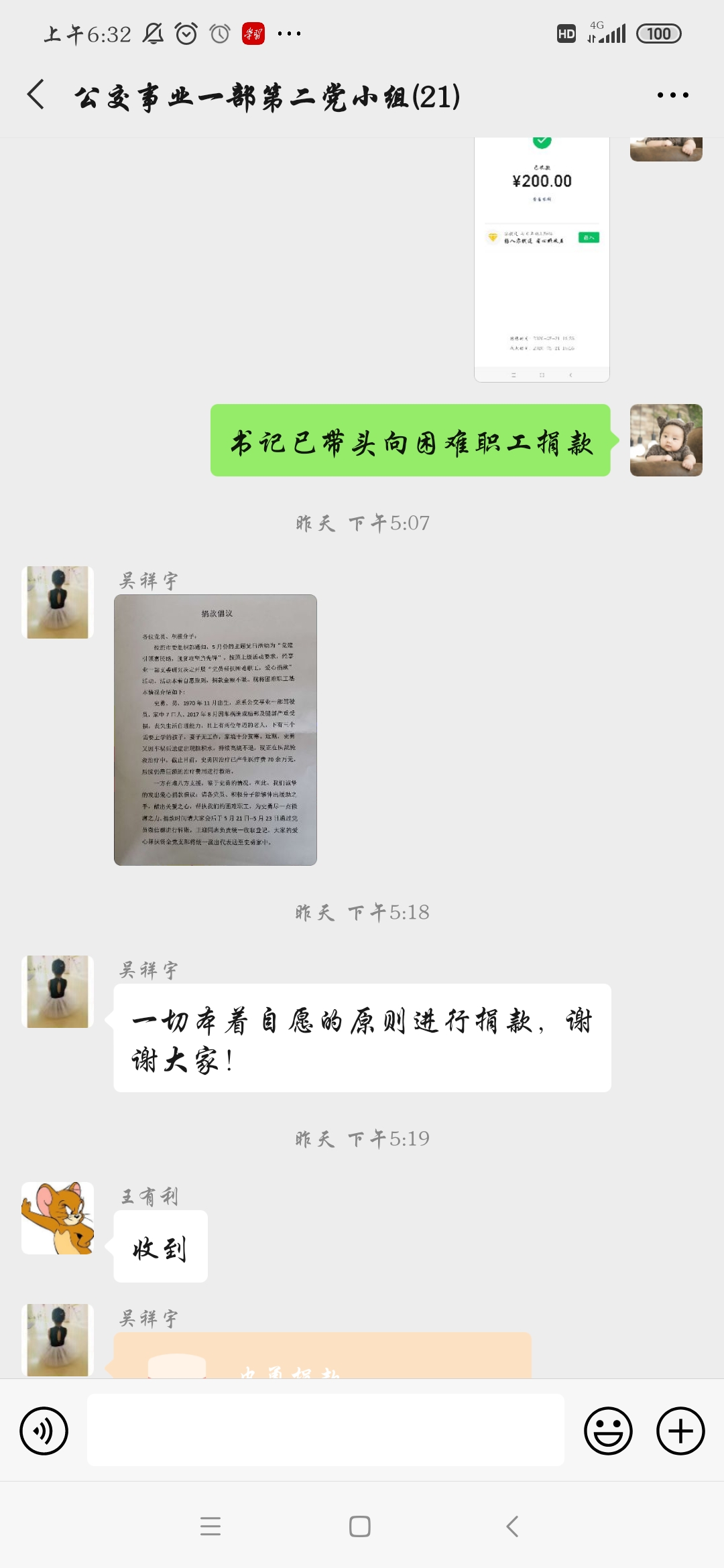 一方有难八方支援,5月21日党支部第一时间发出党员爱心捐款倡议,号召广大党员干部充分发挥先锋模范的表率作用,为史勇捐助善款,伸出援助之手,献出一份爱心,帮助他战胜病魔,挽回宝贵生命。在支部书记王有利、副书记朱华丽的带领下,公交事业一部40名党员、12名积极分子参与此次募捐帮扶活动,共计捐款3230元。