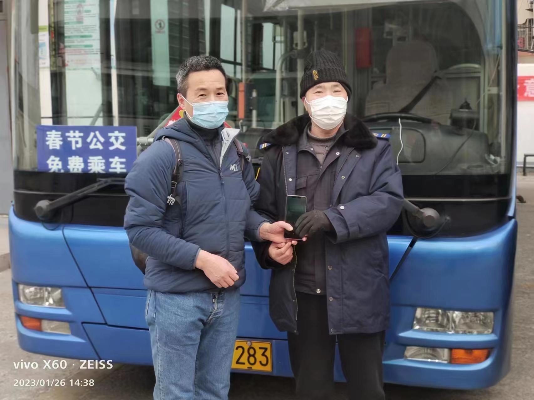不一会儿,一名拖着行李箱的男子着急的向尹继龙师傅的车跑来,上车就询问:“师傅有没有驾驶员捡到一部华为手机?”原来,市民李先生要回南京上班,在自来水公司站乘坐B1K线车到火车站赶火车,可等他到火车站准备拿手机取票时,却怎么都找不着手机了。通过回忆,他清晰的记得在下车前还拿手机看了一下时间,然后将手机塞回口袋拿起行李下车了。难道当时手机根本没塞进口袋里?想到这,他立即拿起行李着急的往回寻找。看着气喘吁吁的李先生,尹继龙让他不要着急,并告诉他自己刚刚捡到一部手机,不知道是不是他丢的,尹继龙一边说一边从驾驶室里拿出手机。看到尹师傅手中拿着手机,李先生高兴地说:“是,这是我丢的手机,我的手机设的是指纹解锁,我解锁给你看。”