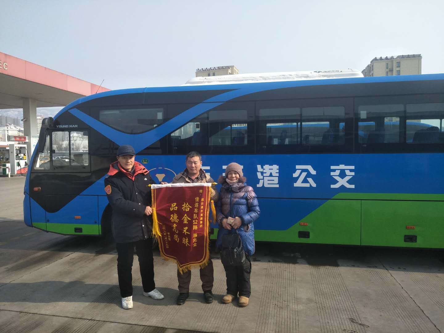 1月29日,公交华亿app最新版下载,华亿(中国)佳连公司车队办公司收到王女士送来的一面锦旗,上面写着“拾金不昧,品德高尚”八个大字,感谢52路驾驶员潘兆全师傅。