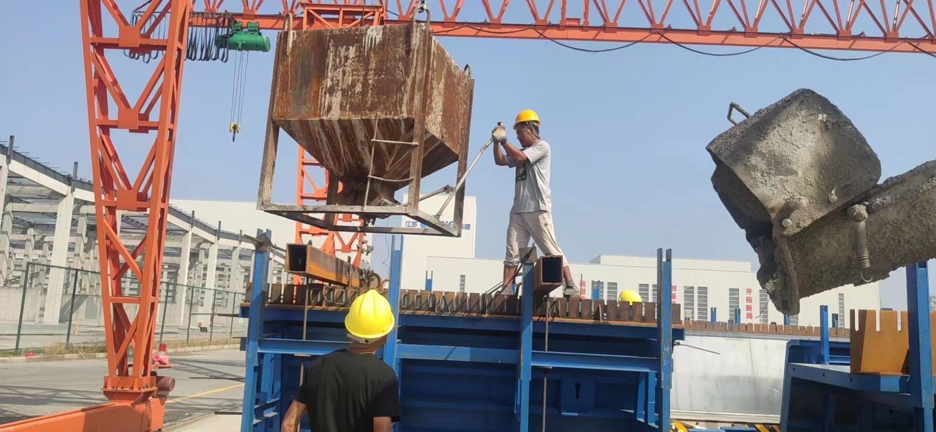 6月24日上午,在江苏海建402省道赣榆南环段路基桥涵工程现场,经过紧张忙碌,顺利完成首件桥梁工程预制箱梁浇筑工作。402省道赣榆南环段路基桥涵工程沭北运河大桥桥梁全长500m,预制箱梁12跨共96榀。本次首件浇筑的目在于通过首件确定混凝土最佳配合比,验证原材料强度、稳定性试验是否可行,从而对混凝土强度及稳定性进行控制,同时通过箱梁首件浇筑对钢筋保护层厚度进行验证,保证后期箱梁大面积施工中钢筋保护层厚度合格率。