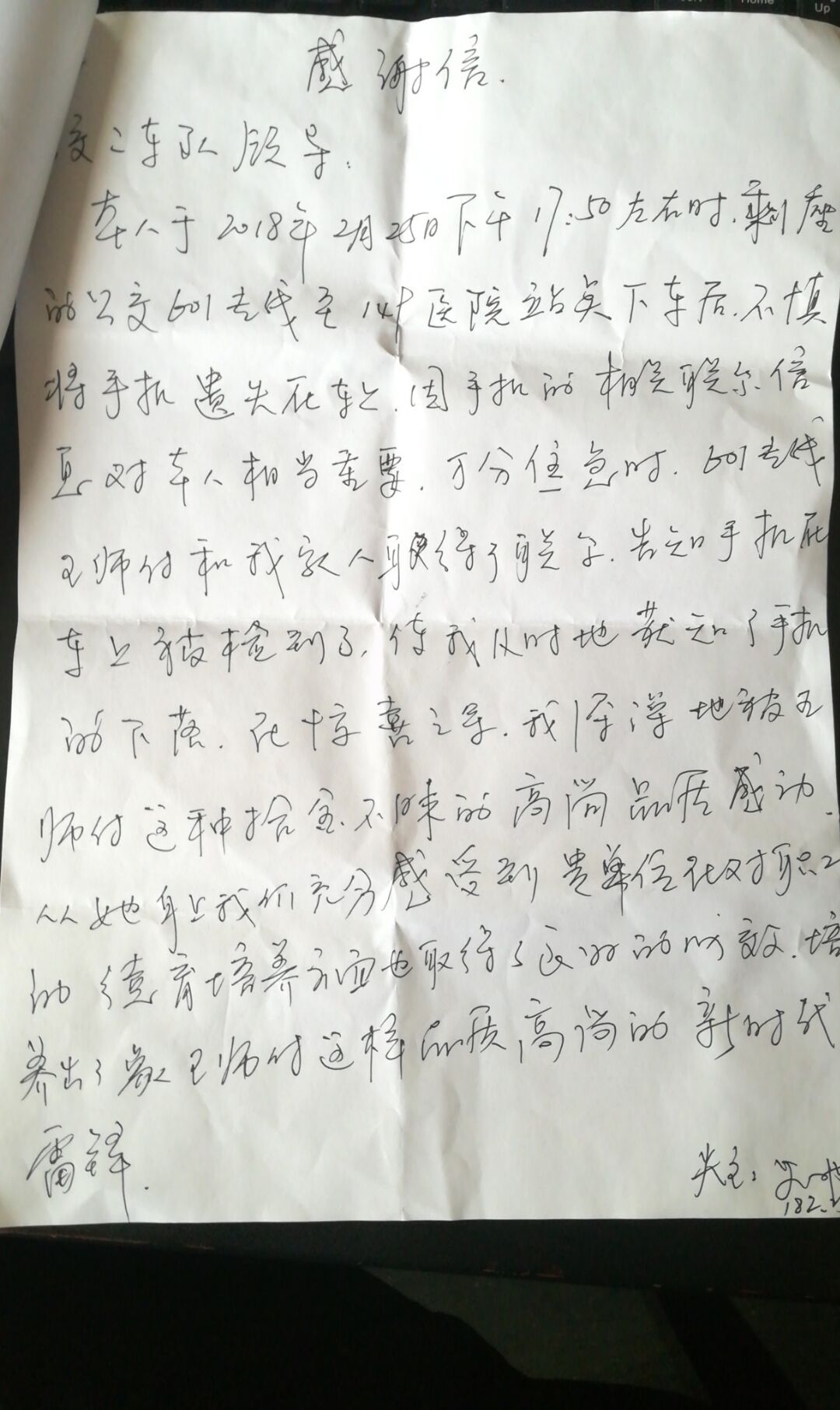 很快,失主史先生到车队见到失而复得的手机后,非常高兴,他怀着感恩之情当场写下感谢信,感谢王伟师傅拾金不昧的高尚品质。