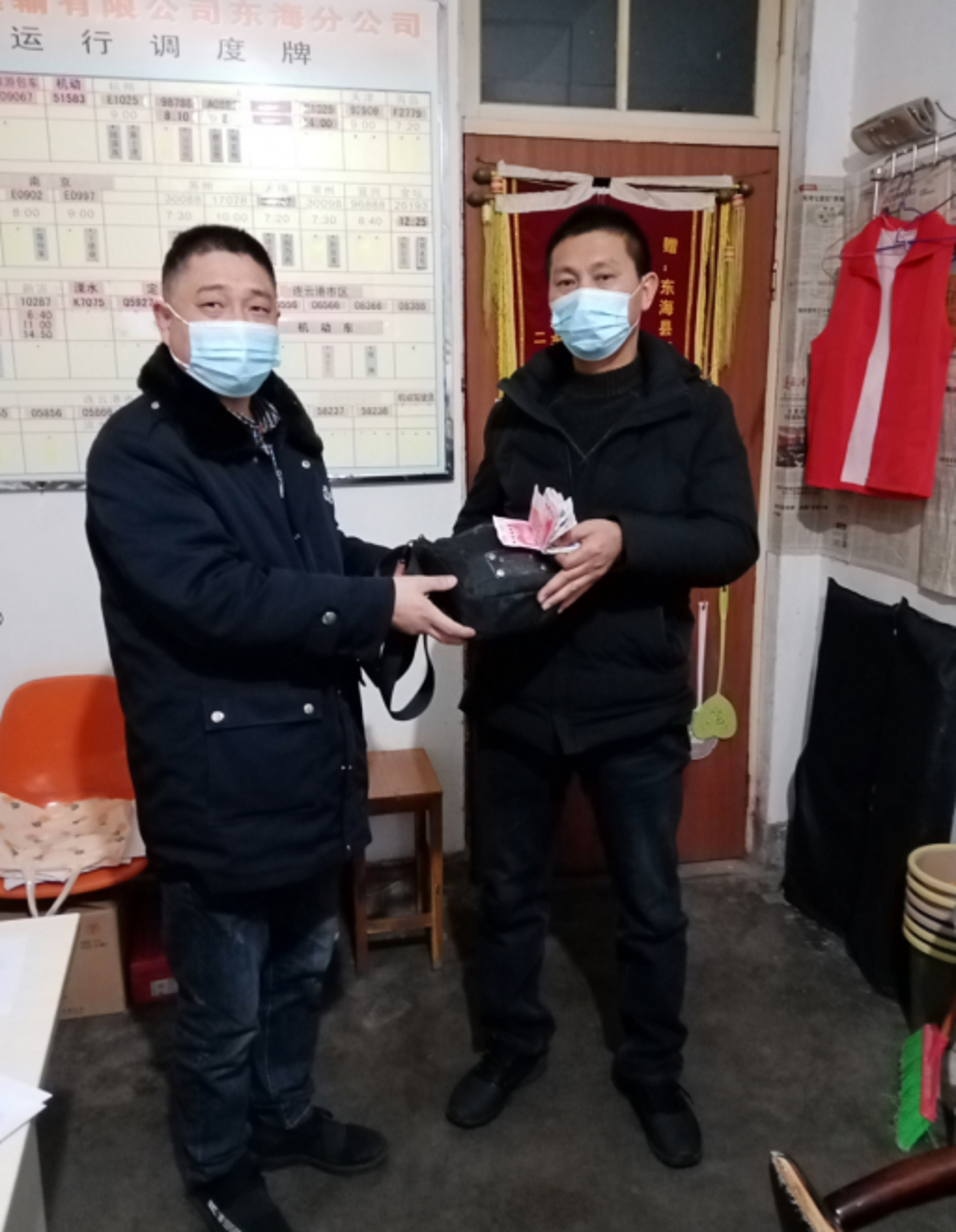 12月30日上午, 连汽东海至苏欣班车返回东海站时,驾驶员韩明军开始打扫卫生,当打扫到中间座位时,在座位上发现了一个黑色皮包。韩师傅急忙跑下车,看有没有人回来找,结果旅客都已经走了。韩师傅马上把黑色皮包送到公司客运科,打开皮包,包内有人民币300多元、银行卡数张以及身份证,无更多的信息,无法立即联系失主。但客运科根据薄先生身份证信息,经多方联系,终于在当天下午与薄先生取得联系,联系到失主后,薄先生激动的都无法用语言表达,只是一个劲的表示感谢。与薄先生电话沟通后,他下午到车站取回钱包。